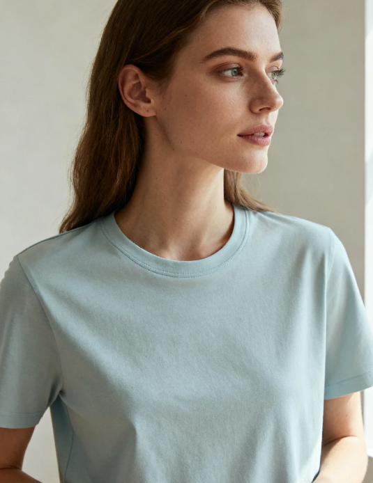 The Classic Cotton Tee uses 100% pure cotton, known for its natural breathability, softness, and durability. This is the traditional, dependable T-shirt style.